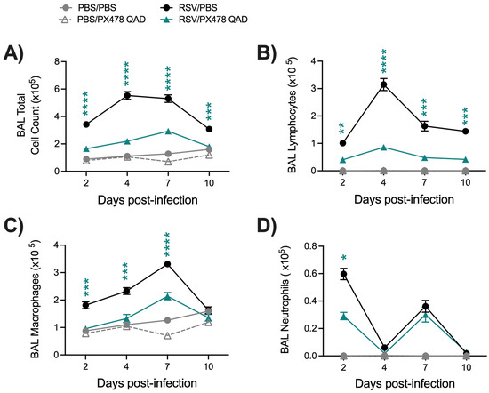Differential cell count of the BAL fluid following HIF-1α inhibition during RSV infection. At days 2, 4, 7, or 10 p.i., BAL fluid was collected from mice that had been treated or not with PX478 QAD. This BAL was used to obtain (A) total cell counts, as well as differential cell counts consisting of (B) lymphocytes, (C) macrophages, and (D) neutrophils. Data are pooled from two independent experiments (PBS/PBS and PBS/PX478 n = 4–6, RSV/PBS and RSV/PX478 n = 10 mice/group). Data are expressed as mean ± SEM. Significant results were determined by two-way mixed ANOVA (* p ≤ 0.05, ** p ≤ 0.01, *** p ≤ 0.001, **** p ≤ 0.0001).