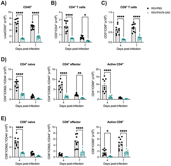 CD4+ and CD8+ T cells play a fundamental role in controlling RSV replication and clearance within the host [17,18,19]. With reduced lymphocyte numbers in the BAL and the complex outcome of viral replication (prolonged viral replication in the PXQD treatment schedule), we next wanted to assess the impact of HIF-1α inhibition on the T-cell population within the lung tissue. To do so, flow cytometry analysis was performed using whole lung tissue at days 4 and 7 p.i., as depicted in Figure S2. RSV-infected mice treated with PXQAD demonstrated a significant reduction in total leukocytes (Figure 4A) and CD4+ (Figure 4B) and CD8+ (Figure 4C) T cells present in the lungs at days 4 and 7 p.i. compared to the RSV/PBS control mice. We then further examined CD4+ T-cell subpopulations, including naïve, effector, and active cells. We found the absolute cell numbers for all three CD4+ subpopulations to be significantly reduced at day 4 p.i. (Figure 4D and Table S1). In accordance, the percentage of effector and active CD4+ cells decreased, while the percent of naïve CD4+ cells increased as compared to the RSV/PBS control mice (Table S1). At day 7 p.i., the absolute cell counts of effector CD4+ T cells remained significantly reduced in the lung tissue of RSV/PXQAD mice. The absolute cell counts for naïve and active CD4+ T cells and the percent change for all three CD4+ subpopulations were comparable to the RSV/PBS control mice at day 7 p.i. (Figure 4D and Table S1).