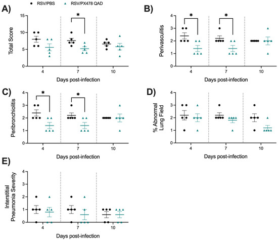 Histopathological scoring of lung tissue following HIF-1α inhibition during RSV infection. At days 4, 7, and 10 p.i., the left lung was collected from RSV-infected mice that had received PBS or PX478 QAD and subjected to FFPE. Cuts of lung tissue were stained with H&E and observed under a microscope at 10× magnification. The (A) total score was calculated, consisting of scores for (B) perivasculitis, (C) peribronchiolitis, (D) percent abnormal lung field, and (E) interstitial pneumonia. Data are representative of one independent experiment (n = 5 mice/group). Data are expressed as mean ± SEM. Significant results were determined by an unpaired Student’s t-test (* p ≤ 0.05).