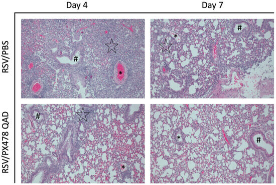Histopathological imaging of lung tissue following HIF-1α inhibition during RSV infection. At days 4 and 7 p.i., the left lung was collected from mice that had received PBS or PX478 every 48 h and subjected to FFPE. Cuts of lung tissue were stained with H&E and observed under a microscope at 10× magnification. Perivasculitis is indicated by an asterisk. Peribronchiolitis is indicated by the hash sign. Interstitial pneumonia is indicated by the black star. No interstitial pneumonia was present in RSV/PX478 QAD on day 7. Representative images are shown here (n = 5 mice/group).