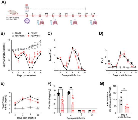 While there is a degree of functional overlap between the HIF-α subunits, they have also been demonstrated to govern a distinct range of biological activities [14]. To better understand the specific role of HIF-2α during RSV infection, mice were administered PT2385 by oral gavage every 24 h at a dose of 50 mg/kg (Figure 7A). Shortly after the first dose, mice were anesthetized and infected with RSV at a dose of 5 × 106 PFU. Uninfected mice that received PT2385 were found to have similar body weight loss and illness scores as the PBS/CO control mice (Figure 7B,C). RSV-infected mice that received PT2385 demonstrated significant improvements in body weight loss at several timepoints over the 10-day disease course as compared to the RSV/CO control mice (Figure 7B). Interestingly, the illness score in RSV/PT2385 mice was worse at day 4 p.i., but treated animals showed a quicker recovery at later timepoints of infection when compared to the RSV/CO control mice (Figure 7C).