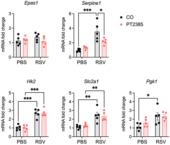 Effect of PT2385 on Epas1 (HIF-2α) and HIF-associated target genes in lungs of mice during RSV infection. A group of mice were euthanized at day 2 p.i., lungs were harvested, and total lung RNA was extracted. Gene expression of Epas1 (HIF-2α), the HIF-2α target Serpine1 (PAI-1), and the HIF-1α targets Pgk1, Slc2a1 (GLUT1), and Hk2 was measured by RT-qPCR (n = 5 mice/group). Data are expressed as mean ± SEM. Significant results were determined by two-way ANOVA followed by Bonferroni’s multiple comparisons test (* p ≤ 0.05, ** p ≤ 0.01, *** p ≤ 0.001).