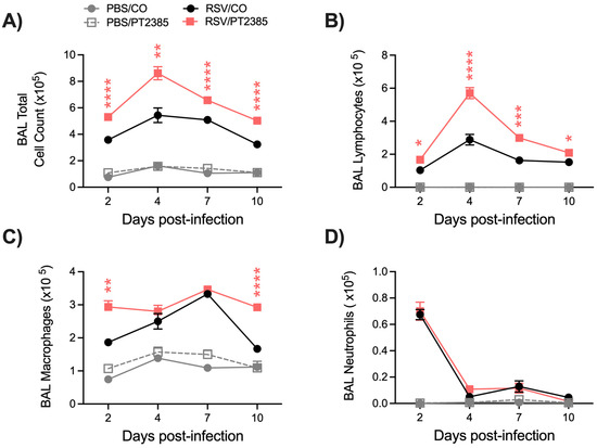 We had previously demonstrated HIF-2α to be dispensable for the control of RSV replication in human small airway epithelial cells. Given the antiviral outcome in RSV/PT2385 mice, we next wanted to understand the contribution of HIF-2α to the immune response during an RSV infection. We first evaluated the cellular composition of the BAL fluid. Uninfected mice that received PT2385 showed no significant difference in BAL cellular composition compared to the PBS/CO control group (Figure 9A–D). RSV-infected mice that received PT2385 demonstrated a significant increase in the total number of cells present in the BAL throughout the course of the infection (Figure 9A), particularly for the number of lymphocytes (Figure 9B), compared to the PBS/CO control group. Macrophage cell counts were also significantly increased at days 2 and 10 p.i. (Figure 9C), while neutrophil cell counts remained comparable to the RSV/CO control mice (Figure 9D).