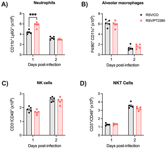 Given the increase in some innate cells in the BAL, we next assessed a few innate immune cells speculated to contribute to RSV antiviral activity by flow cytometry. Whole lung tissue was collected from RSV-infected mice treated or not with PT2385 at days 1 and 2 p.i., the peak of innate immune cell activity in RSV-infected mice. We assessed the tissue for alveolar macrophages, neutrophils, natural killer (NK) cells, and natural killer T (NKT) cells. We found a significant increase in the absolute cell count of neutrophils on day 2 p.i. in the lungs of RSV/PT2385 mice as compared to the RSV/CO control mice (Figure 10A). Absolute cell counts of alveolar macrophages, NK cells, and NKT cells were comparable between the two groups (Figure 10B–D).