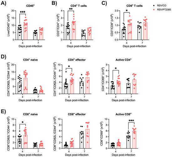 As with HIF-1α, we next assessed CD4+ and CD8+ T-cell responses by flow cytometry analysis. RSV-infected mice treated with PT2385 demonstrated a significant increase in total leukocytes (Figure 11A) and CD4+ (Figure 11B) and CD8+ (Figure 11C) T cells in the lung at day 4 p.i. We further analyzed the CD4+ T-cell subpopulations of naïve, effector, and active T cells. In RSV/PT2385 mice at day 4 p.i., we observed an increasing trend in the total number of CD4+ naïve cells as well as a significant increase in the absolute number of CD4+ effector and active T cells as compared to the RSV/CO control mice (Figure 11D). The percent change at day 4 p.i. was similar amongst all CD4+ T-cell subpopulations when compared to the RSV/CO control mice (Table S2). By day 7 p.i., the absolute cell counts and percent change of all CD4+ T cells in the RSV/PT2385 were of comparable number to the RSV/CO control mice. For CD8+ T-cell subpopulations, we observed a significant increase in the absolute number of CD8+ naïve cells at day 4 p.i., while the absolute cell counts for effector and active CD8+ T cells remained similar to the RSV/CO control mice (Figure 11E). At day 7 p.i., the absolute number of active CD8+ T cells was significantly increased, while the naïve and effector CD8+ cells remained comparable to the RSV/CO control mice (Figure 11E). The percent change was not modified for any CD8+ cells at either timepoint (Table S2). Collectively, these data show that the inhibition of HIF-2α results in increased T-cell numbers, which could contribute to better control of RSV replication, resulting in decreased viral titers.
