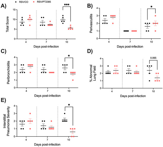 Histopathological scoring of lung tissue following HIF-2α inhibition during RSV infection. At days 4, 7, and 10 p.i., the left lung was collected from RSV-infected mice that had received CO or PT2385 and subjected to FFPE. Cuts of lung tissue were stained with H&E and observed under a microscope at 10× magnification. The (A) total score was calculated, consisting of scores for (B) perivasculitis, (C) peribronchiolitis, (D) percent abnormal lung field, and (E) interstitial pneumonia. Data are representative of one independent experiment (n = 5 mice/group). Data are expressed as mean ± SEM. Significant results were determined by an unpaired Student’s t-test (* p ≤ 0.05, *** p ≤ 0.001).