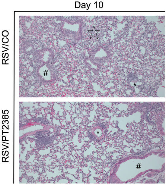 Histopathological images of lung tissue following HIF-2α inhibition during RSV infection. At day 10 p.i., the left lung was collected from mice that had received PBS or PT2385 and subjected to FFPE. Cuts of lung tissue were stained with H&E and observed under a microscope at 10× magnification. Perivasculitis is indicated by an asterisk. Peribronchiolitis is indicated by the hash symbol. Interstitial pneumonia is indicated by the black star. No interstitial pneumonia was present in RSV/PT2385. Representative images are shown here (n = 5 mice/group).