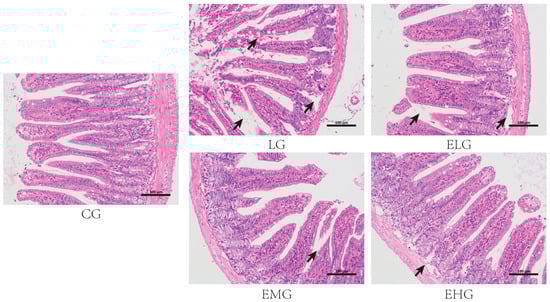 Histopathological manifestations of the intestine in various groups of mice. The control group (CG), negative control group or LPS group (LG), enteral high-dose group (EHG), enteral medium-dose group (EMG), and enteral low-dose group (EHG) are shown. H&E staining showing pathologic changes such as villus shedding and necrosis (black arrow) in different groups. Scale bar: 100 µm.