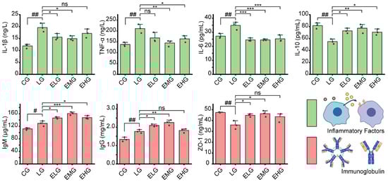 Different intestinal protein levels in all groups of mice. Levels of inflammatory factors, including IL-1β, TNF-α, IL-6, and IL-10, in the small intestinal tissues of mice in all groups and intestinal immunoglobulin levels, including IgM, IgG, and ZO-1, in all groups of mice. For comparison between the CG and the LG: # p < 0.05, ## p < 0.01. Comparing groups ELG, EMG, and EHG to group LG: * p < 0.05, ** p < 0.01, *** p < 0.001. ns: not significant (n = 3, one-way ANOVA and Tukey post-test).