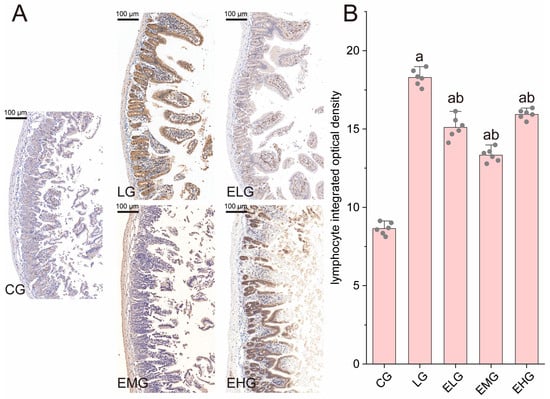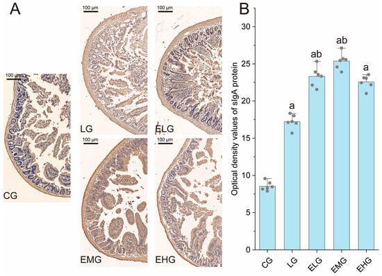 As illustrated in Figure 4, the control group (CG) exhibited baseline sIgA protein distribution with characteristic brown-yellow staining, while the LPS group (LG) displayed marked sIgA upregulation (p < 0.05 versus CG), consistent with LPS-induced mucosal immune hyperactivation. Intervention groups (ELG/EMG/EHG) demonstrated dose-dependent enhancement of sIgA expression, exceeding LG levels.