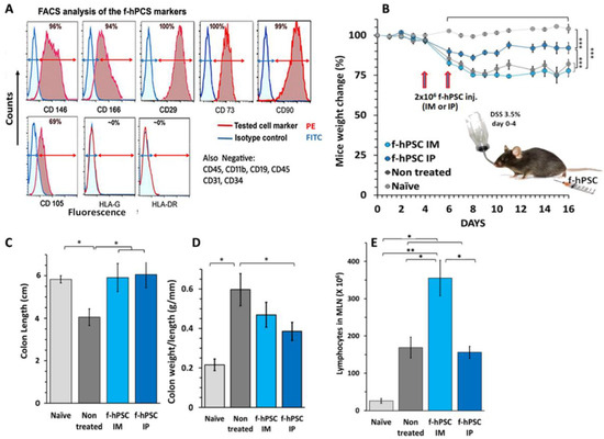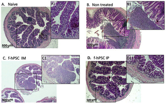 C57BL/6JOla black mice, 8–9 weeks old, were used as a model for induced IBD. The mice were purchased from Harlan/Envigo-RMS Ltd., Jerusalem, Israel (ISO 9001:2015). The animal experiments were planned and performed to conform to the guidelines of the Hebrew-University-Hadassah Medical Center Institutional Animal Welfare Committee for this study (#MD-15-14388-5). The DSS-induced CD mouse model was chosen because cryptitis and crypt depletion, common features of IBD in humans, were also observed in these mice following DSS-induced colitis [32,33]. Though both males and females develop robust DSS-induced IBD by this procedure, the male mice seem to develop a more rapidly aggressive disease than females; therefore, male mice were chosen. Four experimental groups were tested. IBD was induced in three of the groups by DSS exposures, one group of 12 mice was not treated for IBD, 11 mice exposed to DSS were treated IP with f-hPSCs, and an additional small control group of 6 mice were treated IM with the f-hPSC. The experimental system was tested prior to the experiment for dose/complication occurrence to set up the protocol with no loss of animals and verification of no complication of the injection of the cells as previously reported for IM delivery.