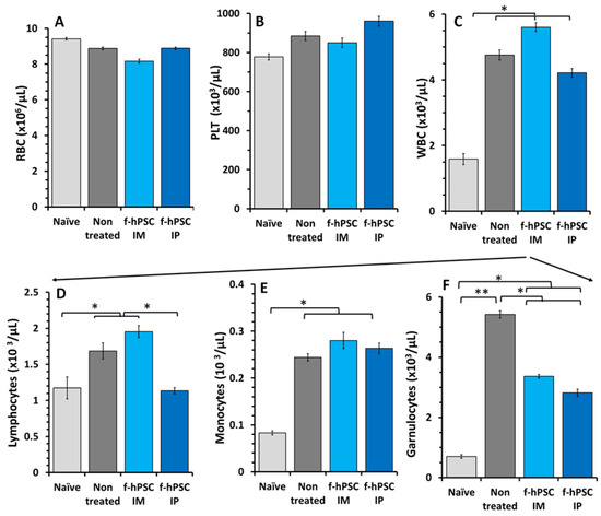 A small non-significant decrease in RBC counts was observed at the end of the experiment across all experimental arms of the DSS-exposed mice (Figure 2A), most likely due to the DSS-induced bleeding in the inflamed GI tract. However, no significant differences between the f-hPSCs-treated and non-treated mice were noted. Platelet counts were slightly and non-significantly elevated in all DSS-exposed mice relative to naïve controls and f-hPSCs-treated groups (Figure 2B). Total white blood cell (WBC) counts, indicative of significant inflammatory processes, increased significantly (p < 0.05) in all DSS-exposed groups, with slightly non-significant higher counts in the non-treated group, compared to the f-hPSCs IP-injected mice (Figure 2C). Similarly, lymphocyte counts were significantly elevated in both the non-treated and IM f-hPSCs-treated DSS-exposed mice (p < 0.05) (Figure 2D, while counts in the IP f-hPSCs-treated group were comparable to the naïve controls and similar to the non-DSS-treated group. Monocyte counts were elevated in all DSS-exposed mice relative to the naïve controls (Figure 2E). The differences in granulocyte counts between the groups were even more apparent, with the non-treated DSS-exposed group showing the significantly highest counts (p < 0.01), compared to less elevated, but still significant (p < 0.05) high counts in DSS-exposed mice treated with f-hPSCs via IM or IP injection (Figure 2F).