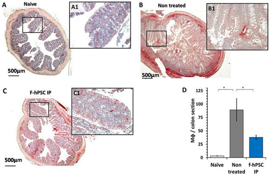 In the control group (Figure 5A,A1), a fewer number of Mϕ are observed in the crypts, primarily located in the periphery. In contrast, in non-cell treated DSS exposed mice with inflamed colon, a high number of Mϕ are present in both the crypts and the submucosa (Figure 5B,B1). Following IP f-hPSCs treatment (Figure 5C,C1), a significant reduction (p > 0.05) in Mϕ density per gut circumference relative to untreated mice was observed, reaching almost their normal density (Figure 5D).