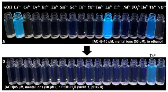 The selectivity response of AOH to Ln3+ and the nuclides Th4+ and UO22+ were tested preliminarily in pure ethanol. In that medium, it exhibited blue luminescence to La3+, Lu3+, and Th4+ (Figure 1a). When changing the medium from pure ethanol to EtOH/H2O (1/1, v/v, pH = 2.0), the detection selectivity was improved and AOH only exhibited strong response to Th4+ with no sensitivity to La3+ and Lu3+ (Figure 1b).