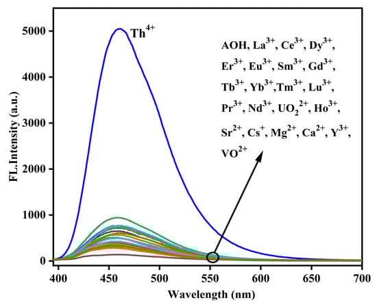 The fluorescence spectra of AOH to Th4+, UO22+, and lanthanide ions (Ln3+) with some alkaline earth metal ions show the sensor response uniqueness toward Th4+ (Figure 2). That specific selectivity is an improvement over reported Th4+ sensors, which are susceptible to the interference from UO22+ and some Ln3+ [,,]. When common metal ions (Na+, Fe3+, Ni2+, Zn2+, Cu2+, Al3+) were added in the AOH solution, no luminescence except that of Th4+ was observed (Figure S5), reproving the specific selectivity to Th4+.