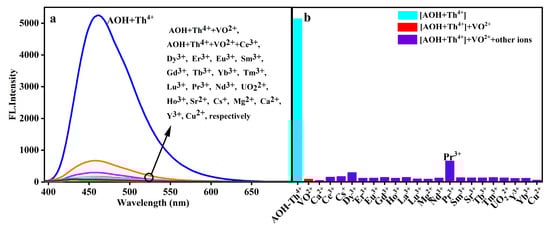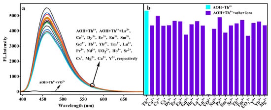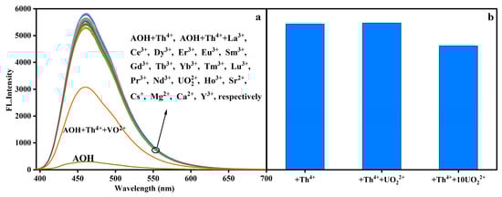 Real Th4+-containing wastes (nuclear waste) contain a large amount of actinide and lanthanide ions in highly acidic environments [,]. The detection of Th4+ thus requires sensors exhibiting good anti-interference properties under acidic conditions. Here, the detection abilities of AOH toward Th4+ in the presence of competing metal ions were investigated (Figure 3). AOH shows excellent anti-interference ability toward Th4+ in the coexistence of tested metal ions except VO2+ (10 equiv.). Even though AOH presents distinguishable emission when VO2+ (1 equiv.) coexisted with Th4+ (10 equiv.) (Figure S6). Interestingly, AOH has an extreme resistance ability to f-block elements, especially to uranyl ions. It shows nearly no interference when 10 folds of UO22+ and Th4+ are mixed with 1 equivalent of AOH. In addition, there was no substantial decline of the fluorescence intensity even when the concentration of UO22+ enlarged to 100 folds over that of AOH (Figure 3b), superior to reported probes [,,]. That will provide the possibility for further separation of the two nuclides using AOH.