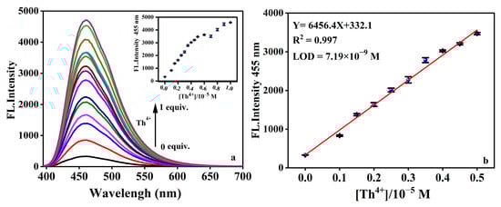The LOD for Th4+ was determined by titration experiments. An increase of the fluorescence emission with a maximum at 455 nm was observed during the gradual addition of Th4+. A linear relationship with the amount of added thorium was seen in the range of 0–5 μM (Figure 4).
