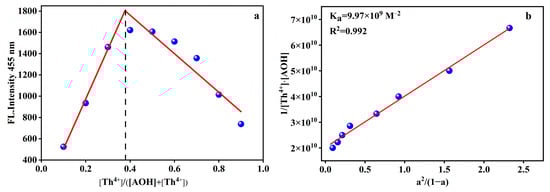 (a) The Job’s plot of AOH–Th4+. (b) Binding constant (Ka) determination of AOH toward Th4+.