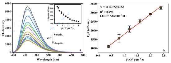 Since VOSO4 is the only salt of VO2+ we could obtain from chemical commercial companies, to prevent the effect of SO42−, 10 folds of BaCl2 which has no effect on the fluorescence intensity of AOH-Th4+ (Figure S11), was added in the process during the titration tests to determine the LOD of the AOH-Th4+ system to VO2+. As shown in Figure 8a, the fluorescence intensity decreases gradually as the concentration of VO2+ increases from 0 to 4 equiv. of AOH. The change of fluorescence intensity at 455 nm is linearly related to the VO2+ concentration in the range of 4 to 24 µM (Figure 8b). The calculated detection limit of AOH-Th4+ to VO2+ is 0.386 µM (31 µg/L), which is much lower than the reference human risk dose of 350 µg/d for vanadium for an adult with a weight of 50 kg (7 µg/kg/d, USEPA. 2021) [].