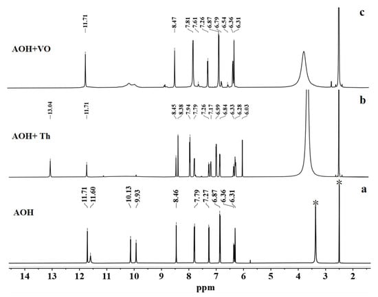 1H NMR spectra of AOH before (a) and after (b) Th4+ and (c) VO2+ addition. The asterisks stand for the solvent signals.