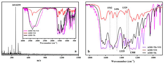 When AOH was mixed with Th4+ and VO2+, the corresponding HRMS spectrum shows the main m/z at 369.0299 (Figure 10a), attributed to the signal of AOH-VO2+ with a 1:1 ratio ([AOH + VO2+ + CH3O− − H+], calculated: m/z 369.0291), indicating that Th4+ is not involved in the binding and that the nuclide ion coordinated to AOH was replaced by VO2+. This speculation was verified by the FT-IR results when AOH was mixed with Th4+ or VO2+ or their mixture (Figure 10b). The signals at 1542 cm−1 and 1456 cm−1 appeared clearly in the mixed sample of AOH with Th4+ and VO2+, which correspond to the characteristic absorption peaks in AOH-VO2+. In addition, the peak at 1335 cm−1 in AOH-Th4+ was shifted to 1329 cm−1 of AOH-VO2+, and the signal at 1308 cm−1 corresponding to the absorption band of AOH-Th4+ disappeared when VO2+ was added in the sample. These changes partly explain the reason for fluorescence quenching of AOH-Th4+ when VO2+ coexisted with it.