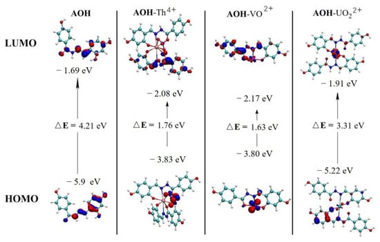 The frontier molecular orbitals of AOH and AOH-Th4+, AOH-VO2+ and AOH-UO22+ complexes.
