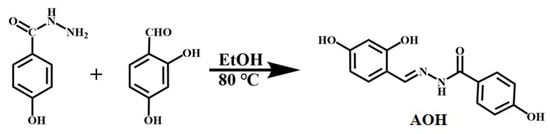 AOH (Scheme 1) was synthesized based on modified processes of our former work []. Typically, 1 mmol (0.156 g) of 4-Hydroxybenzhydrazide was dissolved in 15 mL of ethanol. Then 1 mmol (0.140 g) of 2,4-dihydroxybenzaldehyde in 10 mL of ethanol was added into the above solution. The reaction mixture was stirred at 80 °C for 6 h and the reaction process was monitored by TLC. After the reaction, a large amount of white solid precipitated from the solution. It was collected by filtration and purified by re-crystallization from 40 mL of hot ethanol to obtain the target product: white solid, 0.202 g, yield: 74%. The synthesis route is shown in Scheme 1. 1H NMR, UV-vis, HRMS, and IR spectra (Figures S1 and S2) verified its excellent purity and its structure [].