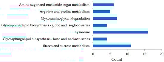Both GO and KEGG network enrichment assessments showed the functional significance of the 685 DEGs. These DEGs were considerably associated with 46 GO BPs, 16 GO MFs, and 1 GO CC (Table S5). The BPs included pathways such as carbohydrate metabolic process, protein phosphorylation, phosphorylation, DNA integration, cell–matrix adhesion, etc. Certain DEGs were classified under the CC category, specifically the extracellular region, while others were related to key MFs, including kinase activity, hydrolase activity acting on glycosyl bonds, protein kinase activity, etc. The KEGG pathway analysis identified seven enriched pathways (p < 0.05), which included starch and sucrose metabolism, glycosphingolipid biosynthesis (lacto and neolacto series), lysosome, glycosphingolipid biosynthesis (globo and isoglobo series), glycosaminoglycan degradation, arginine and proline metabolism, as well as amino sugar and nucleotide sugar metabolism (Figure 2).