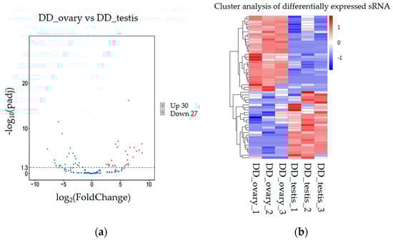 Recent advancements in modern molecular technologies, particularly high-throughput sequencing (HTS) and bioinformatics, have provided a transformative platform for studying miRNAs. These technologies can identify multiple mature miRNAs and precursor small RNAs, deepening the understanding of gene expression regulation. Moreover, HTS has become a widely adopted approach for exploring gene expression and regulatory mechanisms in various aquaculture species [13,14,15], including studies on reproduction and sex-related genes through RNA-seq technology [16,17,18,19]. However, there remains a significant gap in the genetic information of mRNAs and miRNAs associated with sexual maturation and determination in abalone. In this study, HTS was employed for screening of ovarian and testicular differentially expressed genes (DEGs) as well as miRNAs (DEMs) of H. discus hannai. A comprehensive analysis was conducted to integrate these DEGs and DEMs, elucidating their expression profiles and uncovering miRNA–target gene networks associated with sexual maturity and sex determination. These findings offer key insights into the molecular regulation of reproductive traits in H. discus hannai and contribute valuable knowledge to an understanding of abalone reproductive biology.