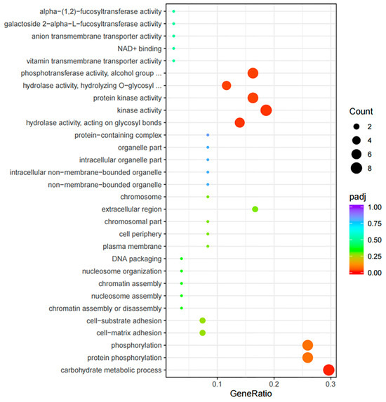 To clarify the MFs of the DEMs in both groups, the target genes of 57 DEMs were analyzed. The analysis identified 13 significantly DE target genes (target-DEGs) associated with 7 upregulated miRNAs and 49 target-DEGs related to 16 downregulated miRNAs (Table S7). Interestingly, certain DE-miRNAs were found to target genes related to reproductive processes. For instance, Verl, Inactive cell surface hyaluronidase CEMIP2 (Cemip2), and Tssk1B were targeted by novel_90, novel_32, and novel_120, respectively, suggesting that these miRNAs may affect reproductive regulation by modulating these genes (Table 3). Figure 4 illustrates a complex interaction network involving the DE-miRNAs and target-DEGs, highlighting their potential significances in H. discus hannai reproductive biology. Moreover, the GO distribution of the predicted target DEGs is depicted in Figure 5. These assessments showed multiple BPs between both groups. Some targets were categorized as BPs, including carbohydrate metabolic process, protein phosphorylation, cell–matrix adhesion, and cell–substrate adhesion. All other targets were related to important MFs, including hydrolase activity acting on glycosyl bonds, kinase activity, protein kinase activity, hydrolase activity hydrolyzing O-glycosyl compounds, and phosphotransferase activity alcohol group as acceptor. A KEGG pathway analysis showed starch and sucrose metabolism significant pathways (p < 0.05).