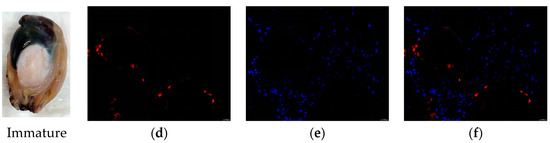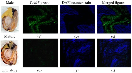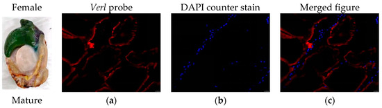 FISH was performed to detect the expression of Verl and Tssk1B mRNAs in the gonadal tissues of H. discus hannai. Fluorescence micrographs revealed that the Verl antisense probe produced strong positive signals (red; Figure 7a,c) in the gonads of mature females, while only weak positive signals were observed in immature female gonads (Figure 7d,f). Similarly, the Tssk1B antisense probe displayed positive signals (green; Figure 8a,c) in the gonads of mature males, but weak signals were detected in the gonads of immature males (Figure 8d,f). Blue fluorescence (DAPI-stained) indicating counterstaining of the positive signal of Verl (Figure 7b,e) and Tssk1B (Figure 8b,e).