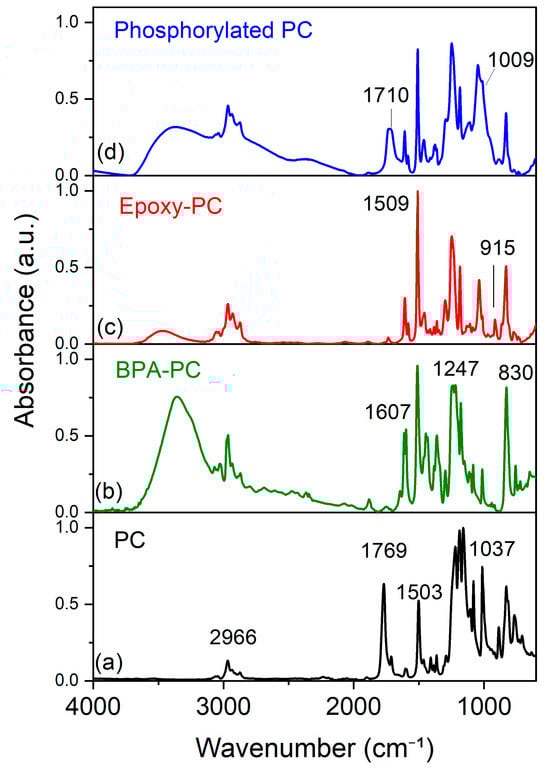 ATR-FTIR spectra of PC, BPA-PC, epoxy-PC, and phosphorylated-PC.