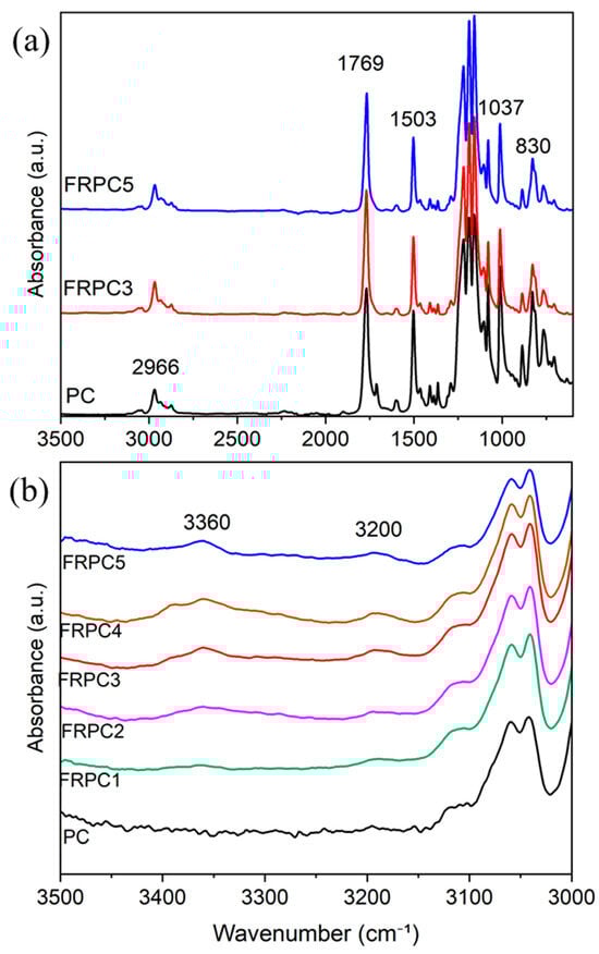 ATR-FTIR spectra of PC and FRPCs: (a) from 600 to 3500 cm−1, and (b) from 3000 to 3500 cm−1.