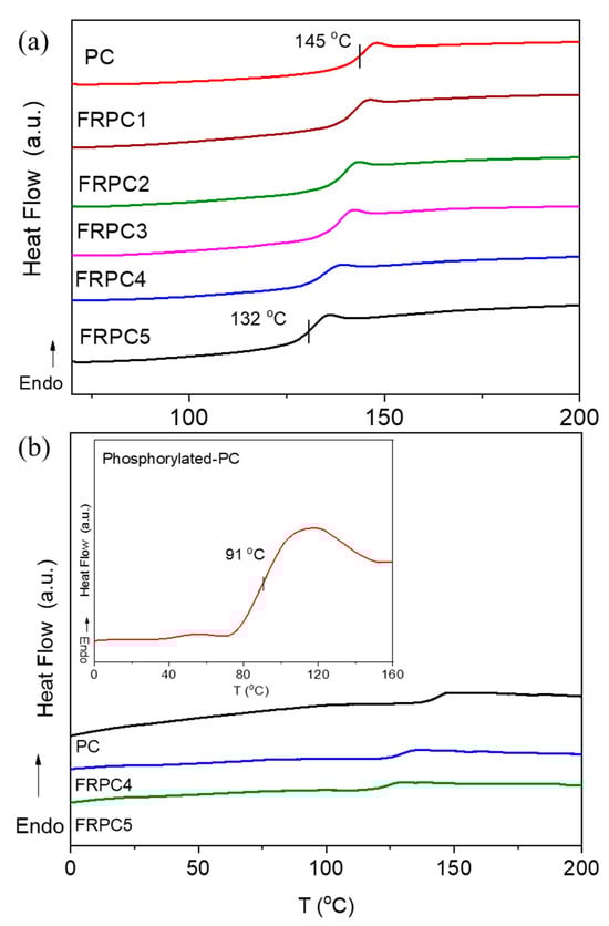 DSC thermograms of (a) all FRPCs compared to neat PC in the range of 60–200 °C, and (b) phosphorylated-PC compared to PC and FRPCs in the range of 0–160 °C.