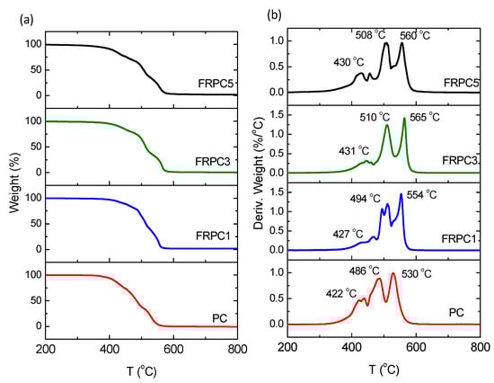 Thermo-oxidative properties of PC, FRPC1, FRPC3, and FRPC5: (a) % weight loss, and (b) derivative weight observed from TGA.