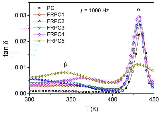 Figure 6 illustrates the dielectric relaxation behavior, tanδ (tanδ = ε″ /ε′), as a function of temperatures at a frequency of 1 KHz. The FRPC samples exhibit two distinct relaxations, occurring below and above the glass transition temperature (Tg), labeled as β and α, respectively. These relaxations correspond to the local (β) and segmental (α) relaxations. PC does not exhibit a dielectric β-process in the glassy state, while FRPC samples show a well-defined β-process, occurring within a temperature range of 65 to 100 °C in the measurement frequency window. This process is likely due to the motion of phosphorylated-PC, which forms hydrogen bonds with the carbonyl groups of PC chains. This behavior is clearly observed for FRPC 3, FRPC 4, and FRPC 5.