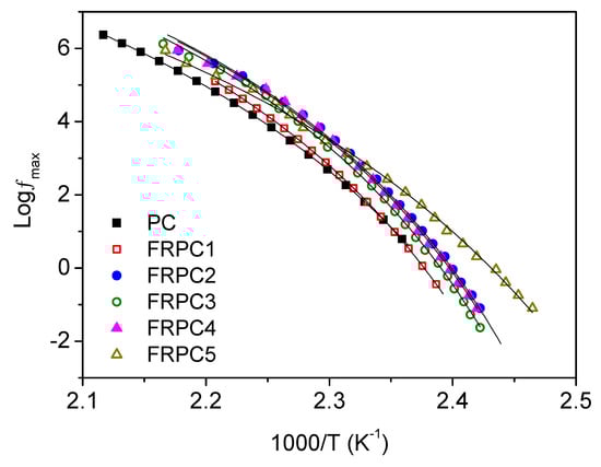 The relaxation frequencies, fmax of the α relaxation as a function of temperature for all samples, are presented in Figure 7. The α relaxations are well modeled using the Vogel–Fulcher–Tamman (VFT) relation (Equation (1)) [], with f0 fixed at 10–14 s.