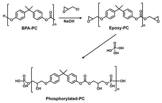 To prepare phosphorylated-PC (bisphenol-A-propyl bis(dihydroxy) phosphate), 0.04 mol of epoxy-PC was dissolved in 80 mL of ethyl acetate, and 0.08 mol of 85% phosphoric acid was added. The mixture was refluxed for 2 h, and the solvent was evaporated using a rotary evaporator at 80 °C. A yellow viscous liquid was obtained. The synthesis procedure is outlined in Figure 10. The viscosity of the phosphorylated-PC and PC solutions (10% w/v in THF) was measured using an AMETEK Brookfield DV2TLV viscometer, yielding values of 5.5 cP and 28.4 cP, respectively.