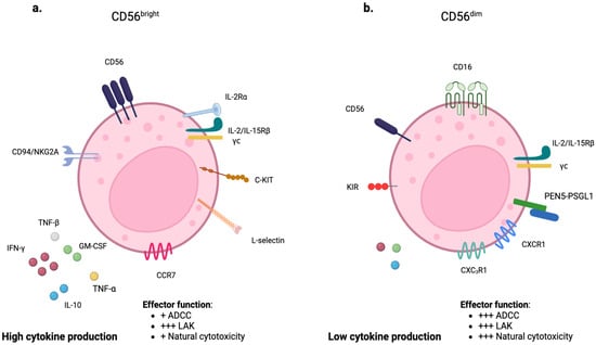 Unlike T lymphocytes, NK cells lack CD3 but express the surface molecules CD56 and CD16. CD56 is a transmembrane glycoprotein mediating the interaction between NK and target cells, while CD16 is a low-affinity receptor for the Fc portion of immunoglobulin G (IgG), representing a potent signal to induce Antibody-Dependent Cell-Mediated Cytotoxicity (ADCC). Two subtypes of NK cells can be distinguished based on the rate of CD56 expression: CD56bright and CD56dim NK cells. CD56dim NK cells have high cytotoxic activity and account for approximately 90% of total circulating NK cells. They represent the final stage of NK-cell maturation and play a key role in ADCC due to an increased expression of KIRs, cytotoxic effector proteins (including perforin and granzyme B), and high surface levels of CD16 [7,8]. Conversely, CD56bright includes the remaining 10% and predominates in secondary lymphoid tissues. They are less mature and cytotoxic but secrete cytokines, primarily IFN-γ and TNF-α, in response to interleukin-12 (IL-12) and IL-18 [9] (Figure 3a,b).