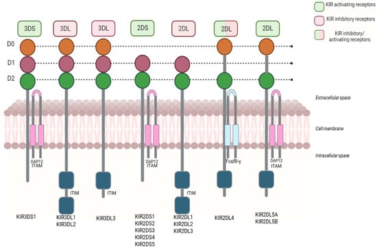 The structure of KIRs consists of three different domains: (i) extracellular; (ii) transmembrane; (iii) and intracellular (Figure 4). The extracellular domain has two or three domains’ Ig-like, named D1 and D2 in most KIR2D receptors; D0, D1, and D2 in KIR3D receptors; and D0 and D2 in 2DL4 and 2DL5. The transmembrane domain crosses the cell membrane, connecting the extracellular and intracellular domains.