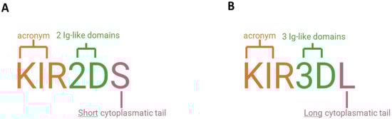 KIRs have a specific nomenclature. Firstly, based on the number of immunoglobulin-like domains, i.e., two or three, KIRs are denoted with the suffixes 2D or 3D, respectively. The letters L (Long) and S (Short) indicate the length of the intracytoplasmic tail (long or short), corresponding to inhibitory or activating activity. Finally, the number following the letter L or S identifies each protein produced [11] (Figure 5).