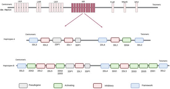 The KIR genes show a high degree of variation in individual gene content and gene copy number [12]. Human NK cells express various combinations of 17 genes with two common haplotypes: A and B [13]. Each haplotype is divided into two regions, centromeric and telomeric. The centromeric region, anchored by the framework genes KIR3DL3 and KIR3DP1, may include KIR2DS2, KIR2DL2 or KIR2DL3, KIR2DL5, KIR2DS3 or KIR2DS5, KIR2DP1, and KIR2DL1. Moving towards the telomeric end from KIR3DP1, the framework gene KIR2DL4 marks the telomeric portion, subsequently bounded by the concluding framework gene KIR3DL2 (Figure 6). This part can include KIR3DL1, along with either KIR2DS1 or KIR2DS4, or KIR3DS1 with either KIR2DL5 and KIR2DS3 or KIR2DL5 or KIR2DS5, and with either KIR2DS1, KIR1D, or KIR2DS4.