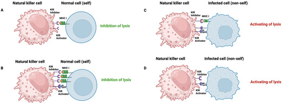 NK-cells activity. It is regulated by a balance of signals from activating and inhibitory receptors: (A) In the absence of interaction between the activating receptor and its ligand on the target cell, lysis is inhibited when inhibitory receptors bind to cognate class I MHC molecules on the surface of the target cell or the normal cell (self). (B) A predominance of inhibitory receptor–inhibitor interactions with class I MHC results in a net negative signal that prevents NK-cell lysis. (C) Activating receptor interactions with ligands on the target cell predominate over weaker MCH class I ligand inhibitory receptor signal, with the net result of NK-cell activation and target cell lysis. This can occur when activating receptors and/or ligands are upregulated, thereby amplifying the net activating signal to overcome the inhibitory signal. (D) Lysis occurs when the activating receptor engages its ligand on the target cell in the absence of interactions with the inhibitory receptor and the MHC class I molecule. MCH: Major Histocompatibility Complex; KIR: Killer immunoglobulin-like receptor.