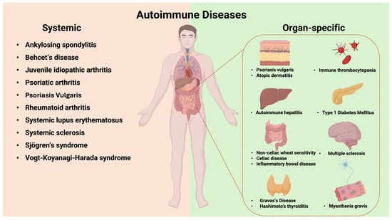 Autoimmune diseases are a group of chronic disorders characterized by aberrant adaptive immune responses to self-antigens [19]. Autoimmune diseases are classified as either organ-specific or systemic based on the localization of autoantibodies (Figure 9). In organ-specific autoimmune diseases, the immune responses target antigens present only in specific tissues or organs, with end-organ damage mediated by antibodies and/or T cells. In systemic autoimmune diseases, the autoimmune response targets self-antigens expressed in multiple organs and tissues, with end-organ injury typically mediated by autoantibodies and, less commonly, T cells. The development of autoimmunity and its progression to autoimmune disease occurs on a continuum, involving a complex interplay between genetic and environmental factors over time. Genetic risk variants and epigenetic alterations predispose individuals to a loss of immune tolerance, leading to the subsequent development of autoantibodies.