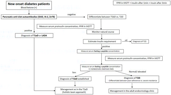 The apparent overlap between T1D and T2D that occurs in obese young patients has resulted in some controversy regarding mixed forms of diabetes, but this does raise unsettling questions about the treatment of T1D in the presence of an insulin-resistant phenotype. There is an etiologic heterogeneity of diabetes even in young ages in Asia. Contrary to Caucasians, the relative proportion of T1aD in young diabetic patients is rather low in Asia. Accepting that the data are very limited, it appears that there is a varying incidence of a T1bD, such as fulminant type 1 diabetes (FT1D) or virus-induced T1D. FT1D exists as a hyper-acute subtype of T1D that affects older children, without causing autoimmunity. They showed a complete loss of β-cell secretory capacity without evidence of recovery, necessitating long-term treatment with insulin (Figure 1). By the way, it also appears that very little is known about the LADA prevalence, especially in Asia. The early diagnosis of LADA or FT1D by appropriate screening methods, such as anti-islet autoantibodies as well as fasting c-peptide concentration in sera of T2D patients, can enhance treatment and potentially lead to methods to slow down the process of destruction against pancreatic β-cells with a possibility to delay or prevent insulin dependency. In addition, practitioners may want to include screening with FPIR in IVGTT and/or its alternatives as well as serum proinsulin concentration (Figure 1) [,,,]. Distinguishing T1D, T2D, and other forms of diabetes in patients with a younger onset is challenging in Asian populations, because the correct diagnosis is clinically important and has implications for prognosis and management. Although reliable biomarkers that can accurately diagnose and stage T1D across the entire disease spectrum do not yet exist, a diagnostic biomarker, in conjunction with a prognostic biomarker, would allow the identification of high-risk individuals on whom resources should be concentrated. Despite etiological heterogeneity, in the usual clinical setting, however, early diagnosis and classification of patients with diabetes relying on clinical grounds including measuring islet autoantibodies and fasting plasma c-peptide could be a possible viable method to minimize complications [].