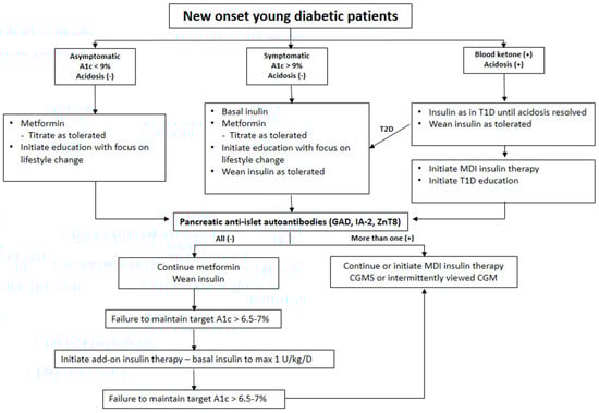 The incidence of T1D in different parts of the world varies considerably, suggesting the involvement of genetic as well as environmental etiologies. A different genetic susceptibility or different genetic and environmental interactions might be involved in the etiology of T1D and autoimmunity. In addition, there may be atypical forms of diabetic patients in some parts of the world, and they have not yet been well described. Nonetheless, the typical T1D patient in Asian young age-groups is believed to be an autoimmune disease resulting from the destruction of pancreatic β-cells [,,]. Considerable evidence supports an autoimmune etiology for the development of T1D in this group. Around 80% to 90% of newly diagnosed patients with T1D have islet autoantibodies [], the prevalence of which decreases with the duration of the disease. T1D in this group is also characterized by emerging antibody levels, much higher before overt disease, and/or by the appearance of multiple islet-associated autoantibodies suggesting epitope spreading. In addition, immune responses to islet auto-antigens can be used as a predictor for impending diabetes among patients with susceptible genetic HLA haplotypes or high genetic risk scores for T1D [,]. Those who are classified as LADA may also be T1D patients initially presenting with T2D phenotypes. Therefore, we can find candidates for the future development of T1D among autoantibody-positive LADA patients []. Notwithstanding, the main current epidemic of diabetes in this pediatric age is a result of surges in T2D incidence. As the general population becomes more obese (and ethnically diverse), reliance on phenotypic characteristics for differentiating between these types of diabetes is becoming increasingly difficult. Nevertheless, the recognition of differences in treatment strategies, associated disorders, family history, and duration of diabetes and cardiovascular outcomes supports the importance of diagnostic efforts to make a distinction between diabetes types at an earlier stage. Initially, to determine the diabetes type, investigation should include ascertaining the presence of autoimmune dysfunction, as well as an assessment of β-cell function (Figure 1). However, it is generally not possible to be certain of diabetes type at the time of diagnosis, and, therefore, initial treatment decisions must be made based on aspects of the presenting physiology, with adjustments in treatment approach made as the individual’s course proceeds and additional information becomes available (Figure 2).
