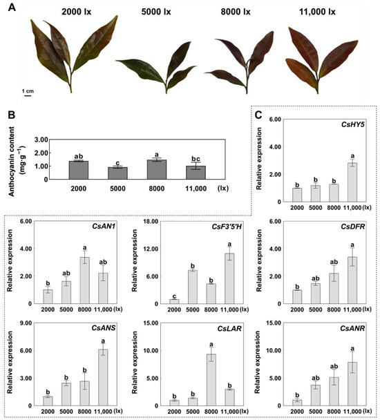 Anthocyanin biosynthesis response to light intensity in Camellia sinensis. (A) Tender leaves of ‘ZJ’ under different light intensity treatments (2000, 5000, 8000, and 11,000 lx). (B) Total anthocyanin content under different light intensity treatments. (C) Expression levels of CsHY5, CsAN1, and anthocyanin biosynthesis genes (ABGs) under different light intensity treatments. Error bars are the SD for three replicate reactions; different letters indicate significant differences determined by the Student’s t-test.