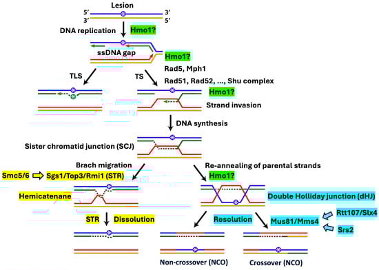 Mechanisms of DNA damage tolerance (DDT). A DNA lesion (asterisk in blue circle) inflicted by genotoxins may stall DNA replication. Uncoupling of DNA polymerase and helicase or re-initiation of DNA synthesis at a distance from the lesion leads to the formation of ssDNA gaps on the leading and lagging strands (a ssDNA gap on lagging strand is shown). Repair/filling of ssDNA gaps can be achieved via the translesion synthesis (TLS) or template switching (TS) pathways that are mechanistically different. SCJ, sister chromatid junction; “Hmo1?” denotes possible position/step of the DDT mechanisms where Hmo1 may act or regulate. See the text for more descriptions.