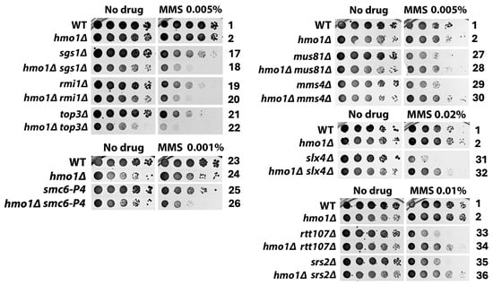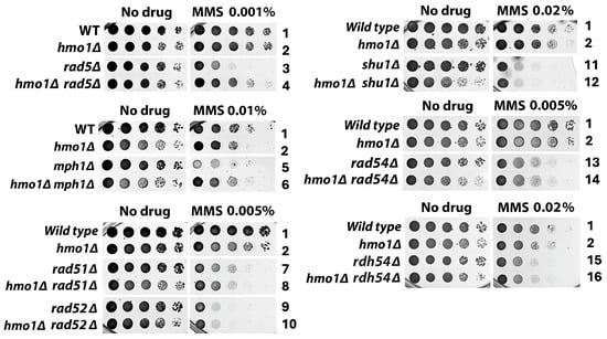 Given that Hmo1 binds DNA with specificities for altered structures such as four-way junctions [] that exist in TS intermediates such as SCJ (Figure 1), we wondered whether Hmo1 is also involved in TS processes downstream of Rad5 and Mph1. Accordingly, we examined the interplay of Hmo1 with TS factors responsible for the formation and processing/removal of SCJs in yeast tolerance to MMS. SCJ formation is mediated by core homologous recombination (HR) factors, including the Rad52 epistasis group of proteins and specialized HR factors such as the Shu complex (Shu1/Shu2/Psy3/Csm2) [,] (Figure 1). Rad51 recombinase promotes the invasion of sister chromatid by ssDNA, which is facilitated by Rad52 and the Shu complex [,,]. Rad54 and Rdh54 aid in the homology search by the Rad51 presynaptic complex []. We found that rad51Δ, rad52Δ, shu1Δ, rad54Δ and rdh54Δ were all dominant over hmo1Δ in affecting cellular tolerance to MMS (Figure 2, compare strains 7 and 8, 9 and 10, 11 and 12, 13 and 14, and 15 and 16). As such, the RDA51, RAD52, SHU1, RAD54 and RDH54 genes were all epistatic to HMO1 in cellular tolerance to MMS, suggesting a role for Hmo1 in the TS pathway downstream of HR factors that promote SCJ formation (Figure 1).