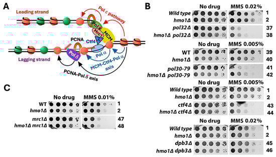 To examine whether Hmo1 impacts DDT by modulating replication-coupled chromatin assembly, we examined the interplay of Hmo1 with components of the parental histone transfer and new histone deposition pathways in cellular tolerance to MMS. We showed that hmo1Δ partially suppressed the MMS sensitivity of the pol32Δ mutant (Figure 4B, compare strains 37 and 38). Pol32 interacts with PCNA, and disrupting this interaction by the PCNA mutation pol30-79 also sensitizes cells to MMS [,]. (Note that PCNA is a homotrimer of the Pol30 protein.) We found that hmo1Δ also suppressed the MMS sensitivity of the pol30-79 mutant (Figure 4B, compare strains 41 and 42). These results placed Hmo1 upstream of Pol32 in the PCNA-Pol δ mediated pathway of parental histone H3/H4 transfer to the lagging strand. We found CTF4 to be epistatic to HMO1 in MMS tolerance (Figure 4B, compare strains 43 and 44), suggesting that Hmo1 functions downstream of Ctf4 in the MCM-Ctf4-Pol α-mediated parental histone transfer pathway. We noted that dpb3Δ had little effect on cellular tolerance to MMS (Figure 4B, compare strains 1 and 45), which is consistent with similar findings in prior studies []. The deletion of Hmo1 did not significantly affect the survival of the dpb3Δ mutant in the presence of MMS (Figure 4B, compare strains 45 and 46). In addition, we found MRC1 to be epistatic to HMO1 in MMS tolerance (Figure 4C, compare strains 47 and 48), suggesting that Hmo1 functions downstream of Mrc1 in regulating parental histone transfer. These results suggest that Hmo1 functions in parental histone recycling, especially lagging strand-specific histone transfer that seems to impact DDT more than leading strand-specific histone transfer.